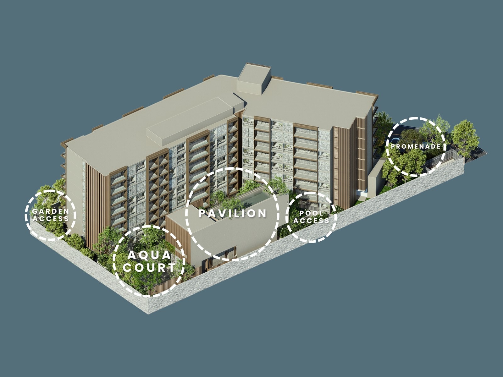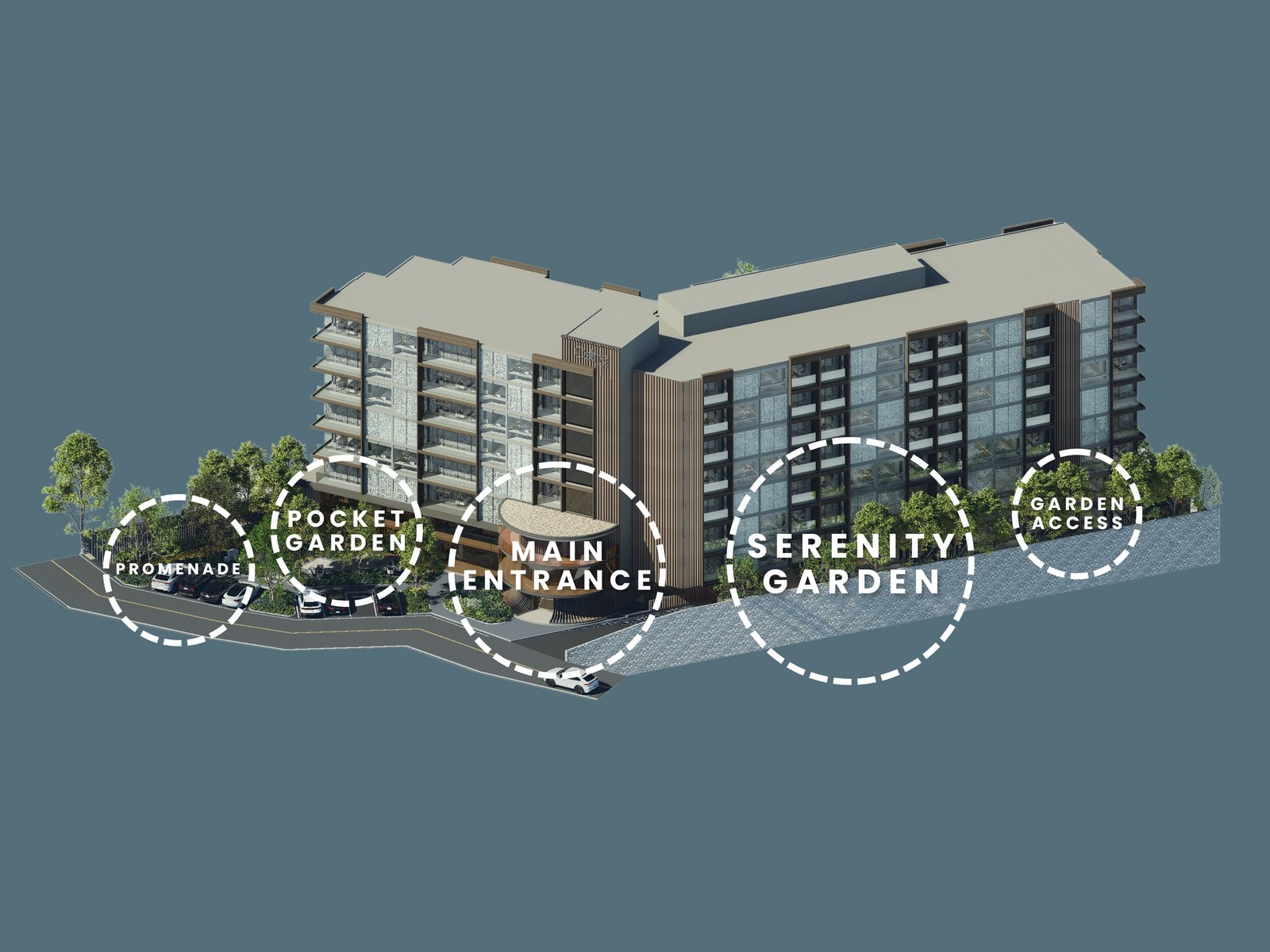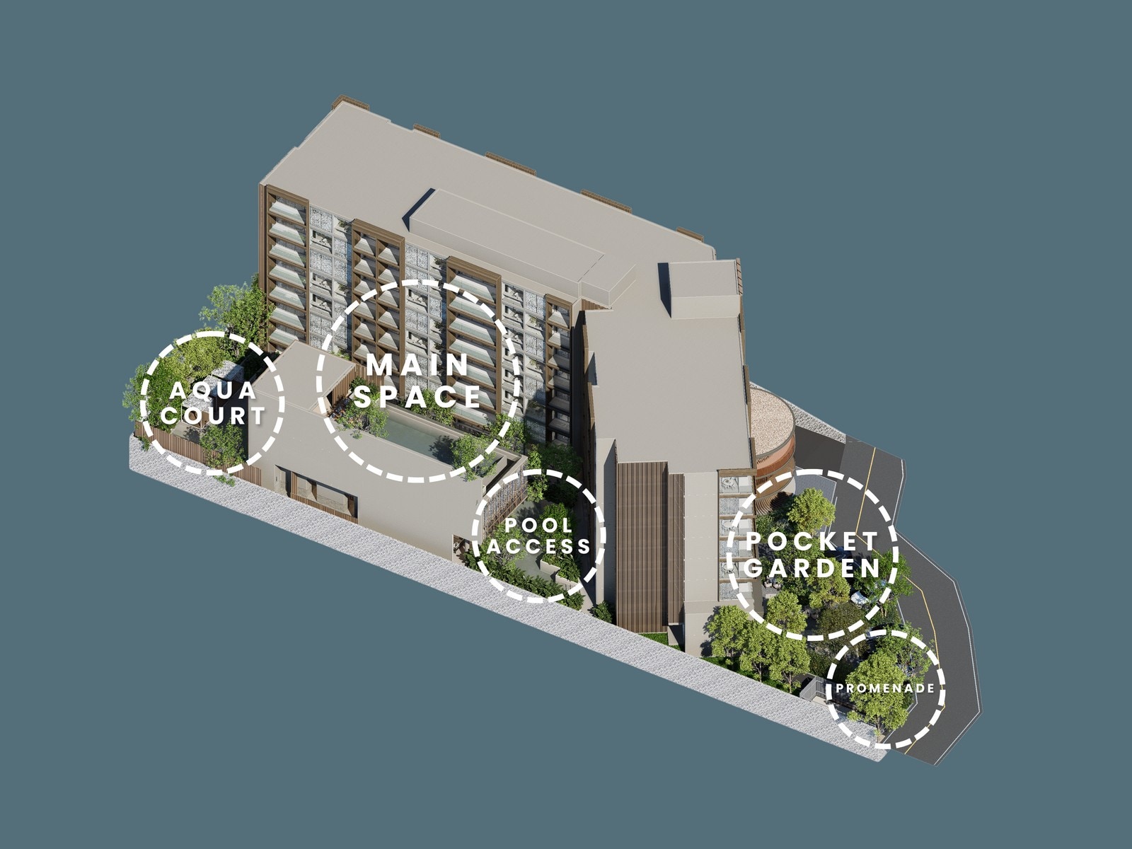 Архитектура комплекса выдержана в современном минимализме: чистые линии, мягкие оттенки, много стекла и горизонтальные балконы, за счёт чего здание визуально «растворяется» в зелени и не доминирует над ландшафтом. Образ дополняют аккуратно спланированные садовые зоны, водные элементы и продуманная подсветка, превращающие внутреннее пространство в зелёный оазис с ощущением приватного клубного резорта в одном из самых престижных районов Паттайи.
